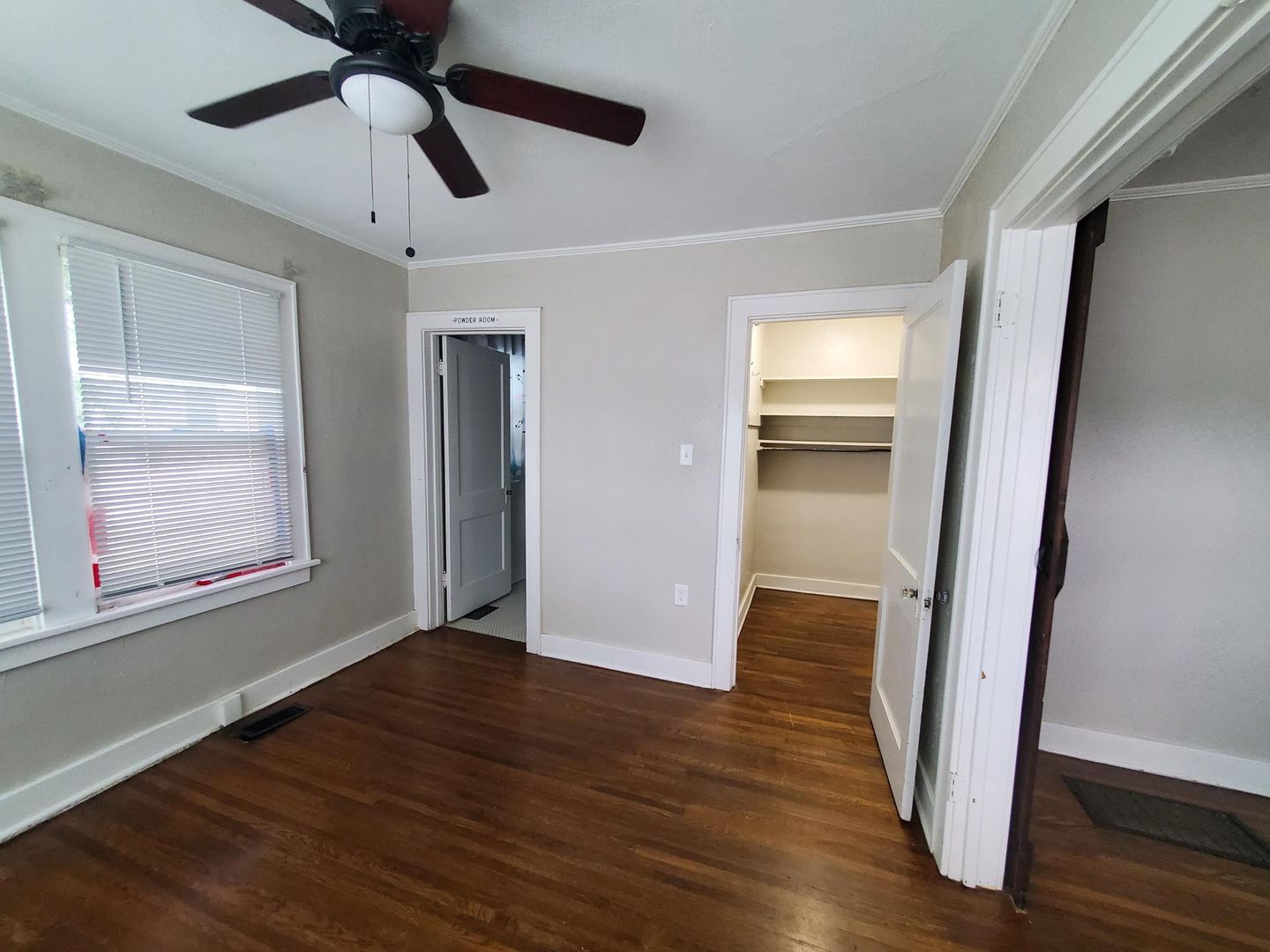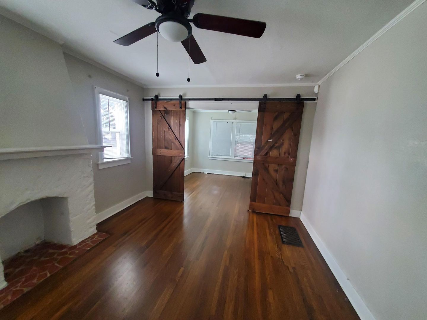 A cozy space with the ability to open it up or close it in with a nice, stained sliding door.